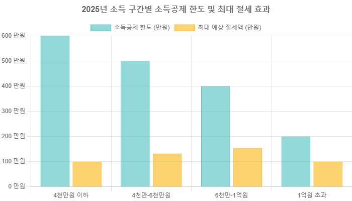 노란우산공제에 납입한 금액은 연간 최대 600만원까지 소득공제 대상에 포함됩니다. 2025년 기준으로 공제 한도와 절세 효과는 연 소득 수준에 따라 다음과 같이 차등 적용됩니다.