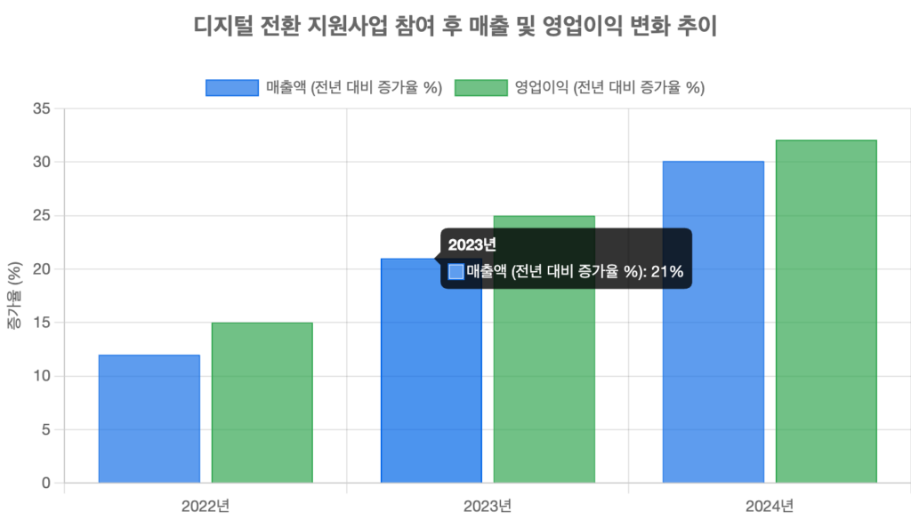 디지털 전환 지원사업은 정부와 지자체가 소상공인의 디지털 역량 강화와 경쟁력 제고를 위해 제공하는 프로그램입니다. 2024년 발표된 한 조사 결과에 따르면, 디지털 전환 지원사업에 참여한 소상공인의 30.1%가 매출 증가 효과를 경험했다고 보고되었으며, 32.1%는 영업이익이 상승한 것으로 나타났습니다. 이는 매우 고무적인 수치입니다.