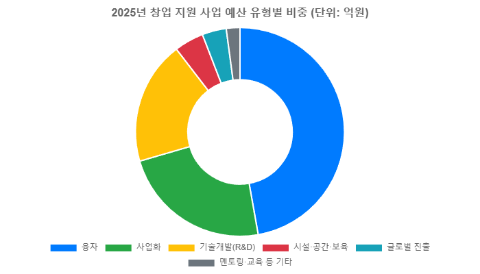 2025년 창업 지원 정책의 가장 큰 특징은 ‘;융자’와 ‘사업화’ 지원의 양대 축을 중심으로 구성되었다는 점입니다. 전체 예산의 약 70%가 이 두 분야에 집중되어, 창업 초기 자금 조달과 시장 진입을 실질적으로 돕겠다는 정부의 강력한 의지를 보여줍니다.