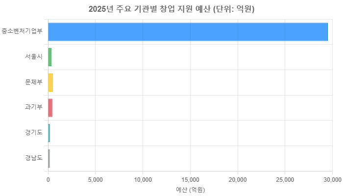 기관별로는 중소벤처기업부가 전체 중앙부처 예산의 94.6%에 달하는 2조 9,499억 원을 집행하며 창업 지원 정책을 주도합니다. 지자체 중에서는 서울시(382억 원)와 경기도(200억 원)가 가장 많은 예산을 편성하여, 해당 지역 창업 생태계 활성화에 적극적으로 나서고 있습니다. 이는 창업을 준비하는 지역에 따라 활용 가능한 자원의 규모가 다를 수 있음을 시사합니다.