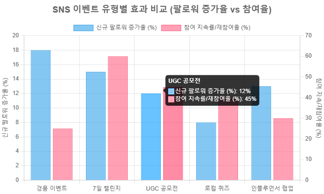 최근 데이터를 종합 분석한 결과, 이벤트 유형별로 뚜렷한 성과 차이가 나타났다. 아래 그래프는 소상공인이 주로 활용하는 이벤트 유형별 평균 팔로워 증가율과 참여율을 시각화한 것이다.