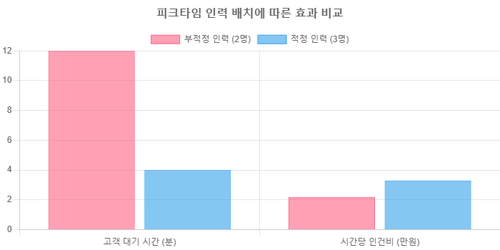 피크타임 시 적정 인력(3명) 배치가 고객 대기 시간을 크게 줄이지만, 인건비는 소폭 상승하는 트레이드오프 관계를 보여줍니다.