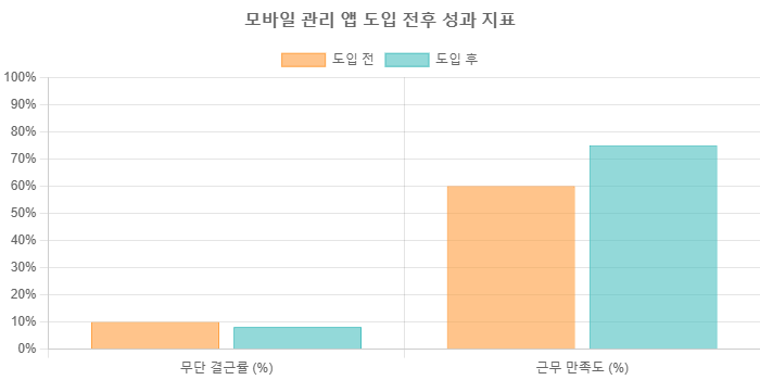 모바일 인력관리 앱 도입 후 무단 결근률은 감소하고, 근무 만족도는 크게 향상된 효과를 보여줍니다.