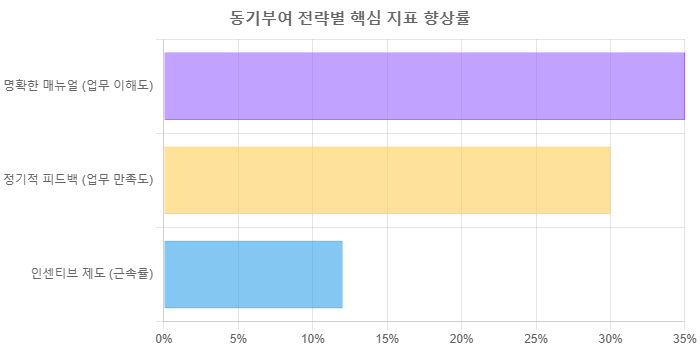각 동기부여 전략이 업무 이해도, 만족도, 근속률 등 핵심 지표에 미치는 긍정적 효과를 나타냅니다.