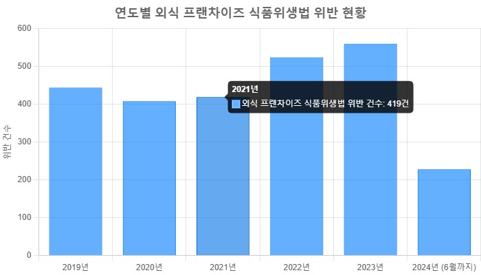 2024년 식품의약품안전처가 발표한 자료에 따르면, 최근 5년간 외식 프랜차이즈에서 가장 많이 적발된 위반 유형은 ‘기준 및 규격 위반'(이물 혼입 등)이 39%로 가장 많았으며, ‘위생교육 미이수'(24.8%), ‘위생적 취급기준 위반'(11.4%), ‘건강진단 미실시'(8.3%) 순으로 나타났습니다. 관련 보도에 따르면, 이러한 위반 사항에 대한 행정처분은 과태료 부과(44.5%)와 시정명령(42.7%)이 대부분을 차지했습니다. 이는 경미한 위반이라도 반복될 경우 더 큰 문제로 이어질 수 있음을 시사합니다.
