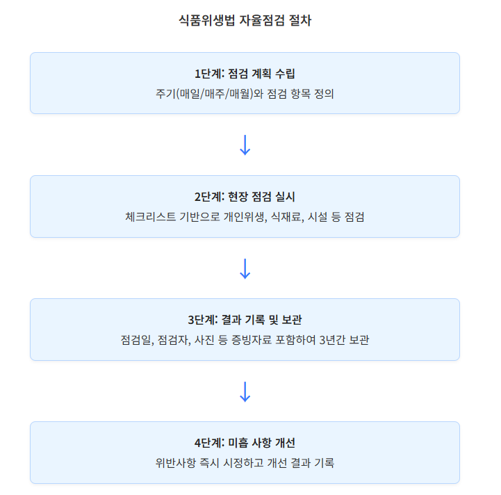 - ✅ 자율점검 정기 수행, 점검일·점검자 서명·사진 포함한 증빙자료 최소 3년 보관