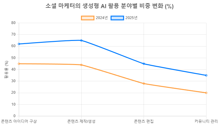 Hootsuite의 소셜 미디어 트렌드 보고서에 따르면, 소셜 미디어 마케터들의 생성형 AI 활용도는 폭발적으로 증가하고 있습니다. 특히 콘텐츠 제작 분야에서의 활용률은 2024년에 비해 크게 상승하며, AI가 콘텐츠 마케팅의 필수불가결한 요소가 되었음을 보여줍니다.