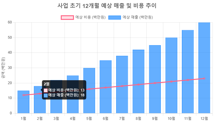 사업 초기 12개월 예상 매출 및 비용 추이를 시각화한 그래프는 투자자 신뢰도 제고에 필수입니다. 대표적으로 1년 차 월별 매출 계획과 비용 현황을 동시에 보여주는 그래프 작성이 권장됩니다.